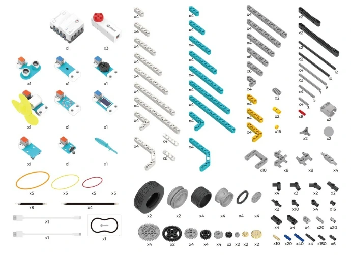 Nezha Pro Beakout board, 3 Motoren, 8 sensoren en tal van onderdelen.